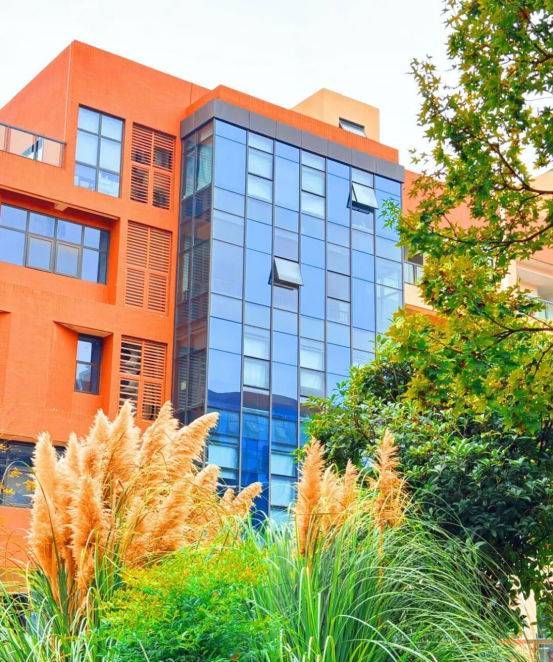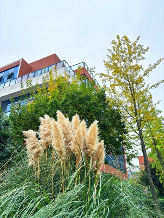 B区中庭的阶梯旁,夕阳为芦苇荡披上柔光,悄然呼应着“蒹葭苍苍,白露为霜”的古典意境。它们不似春花娇艳,却独具一份坚韧风骨,芦花在风中摇曳,与现代建筑共构一幅动静相宜的画面。这里不仅是午间散步的优选之地,更是研发人员激发灵感、平衡思绪的静谧港湾。